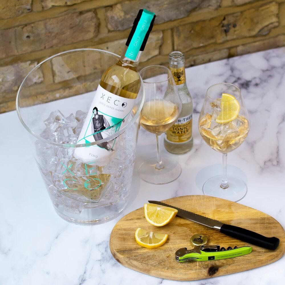 Droge witte wijn, gemaakt van palamino-druiven, gerijpt onder een gistlaag.